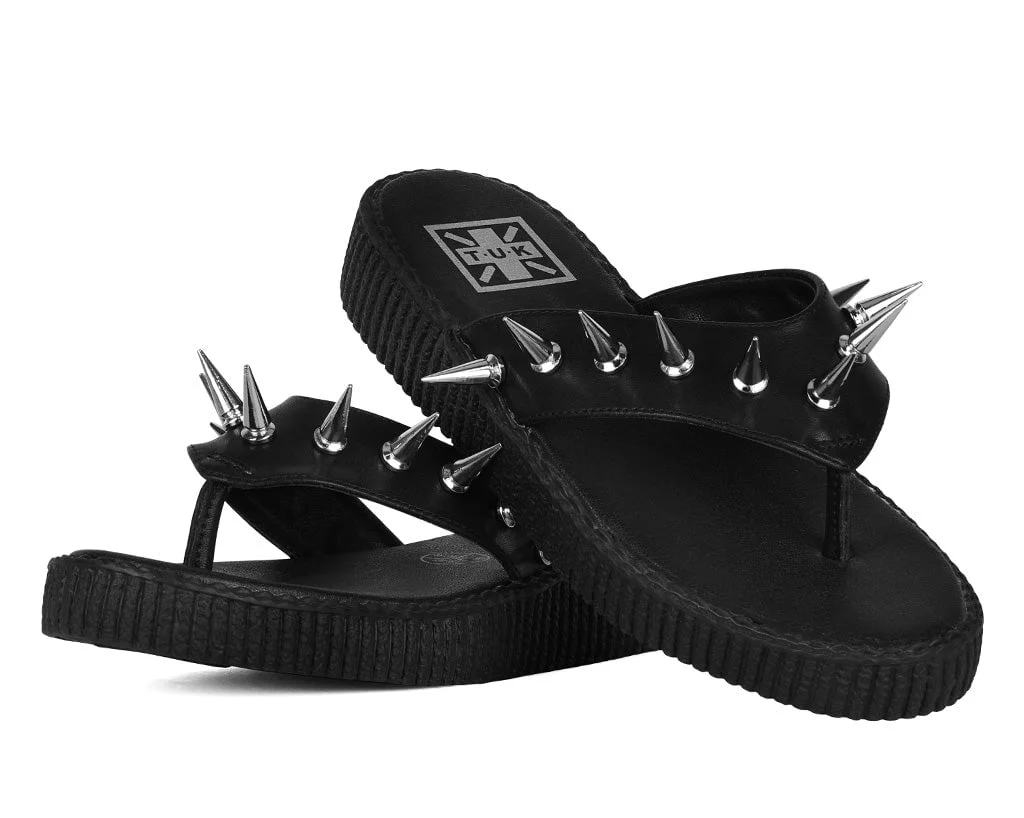 No platform, no problem. Features a black TUKskin flip-flop strap with silver spikes. Sits on top of our lightweight, VIVA low sole creeper platform that measures 1 ¼” at the heel and ¾” in the front.