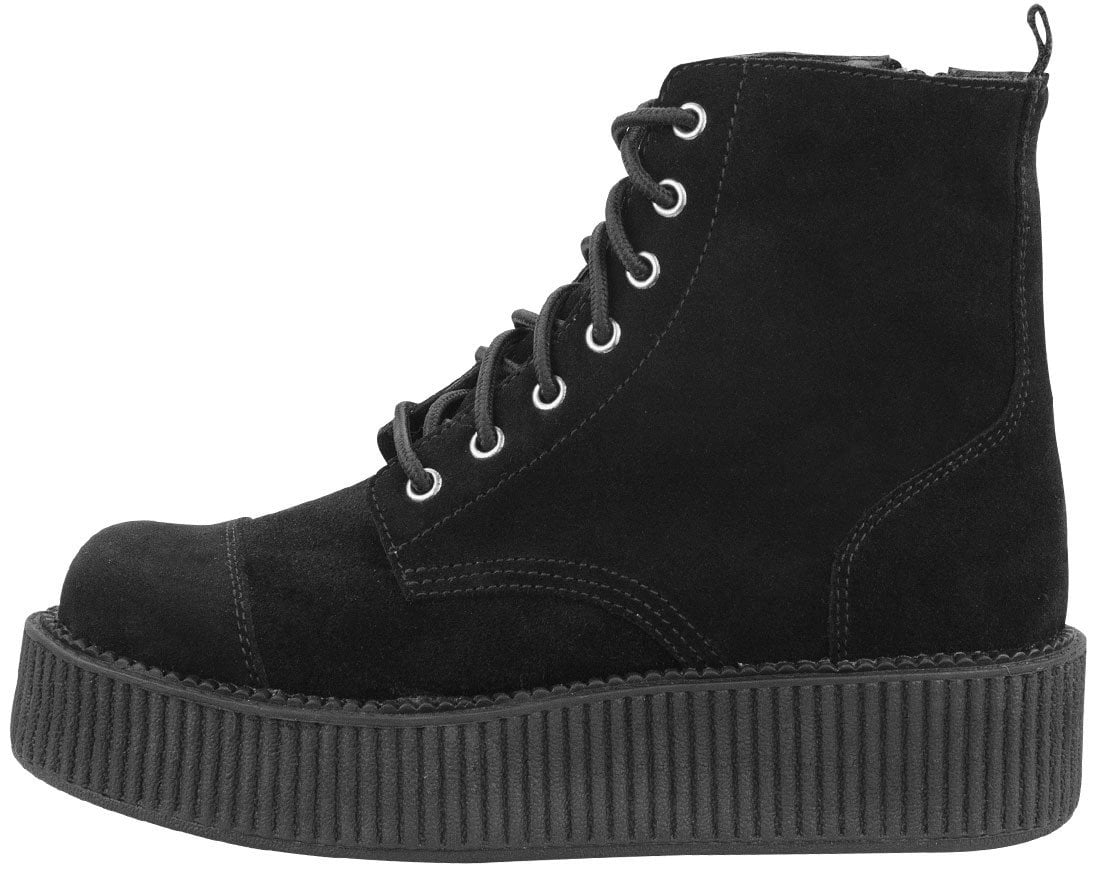 These suede boots are a combination of two of our T.U.K. Classics. We have taken a 7 eye suede Anarchic boot upper and combined it with our Viva Mondo creeper soles and BOOM! The result is our new funky fabulous T.U.K. Viva Mondo creeper boots! The platform measures 1.75” at the heel with a 1.25” tall front. The new Viva Mondo creeper sole is nice and lightweight so you can be quick and comfy while you’re beatin’ the streets.