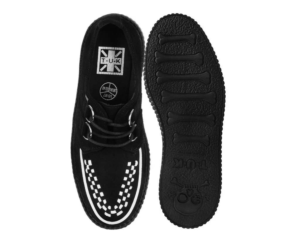 These black suede creepers have contrasting white interlace and feature the new lightweight and more flexible soles in our traditional 1 7/8" Mondo height. These creepers have a white woven interlace, and silver metal D-rings.