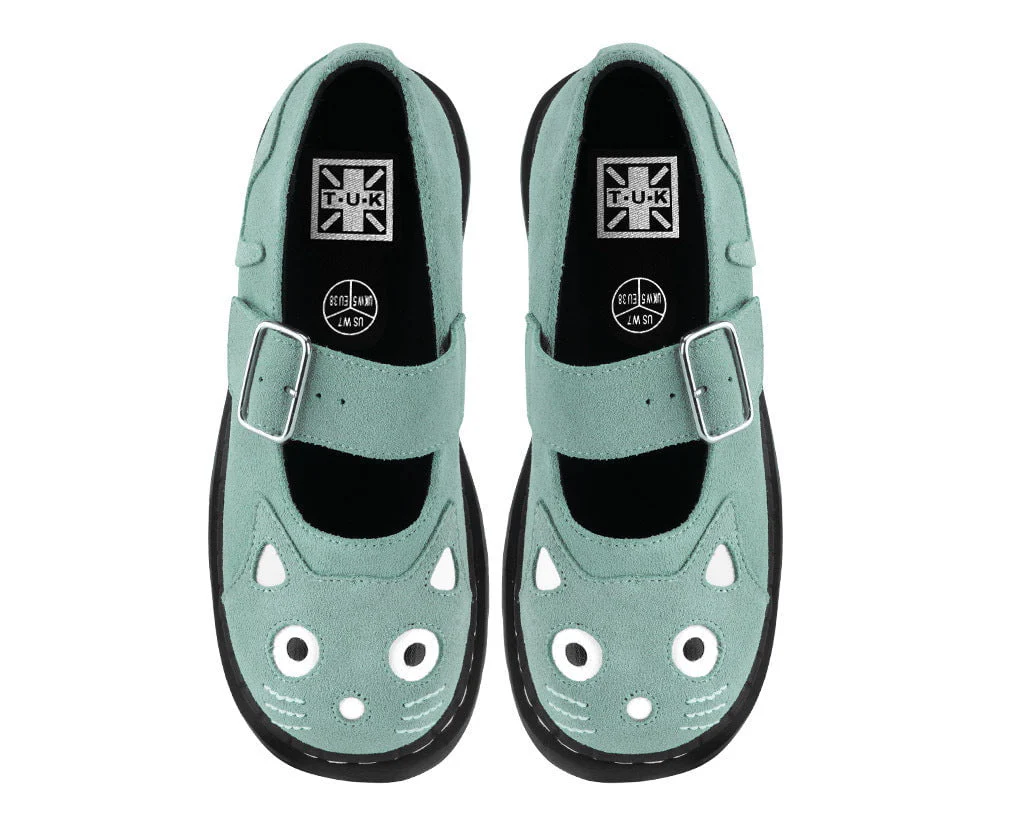 The Original Kitty Mary Janes. Pale Blue Suede Kitty Mary Jane with White Details, a Silver Metal Buckle, and a 1 1/2 inch Heel.