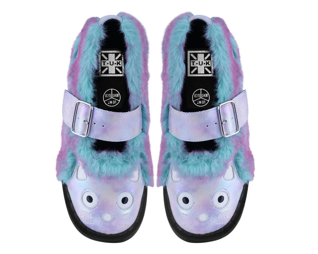 The Original Kitty Mary Janes. Teal & Pink Furry Kitty Mary Jane with a Silver Metal Buckle, and a 1 1/2 inch Heel.